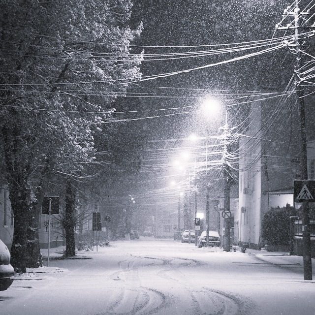 The snow streaked in the night like falling stars around my feet, suddenly lit by the oncoming headlights of a car.